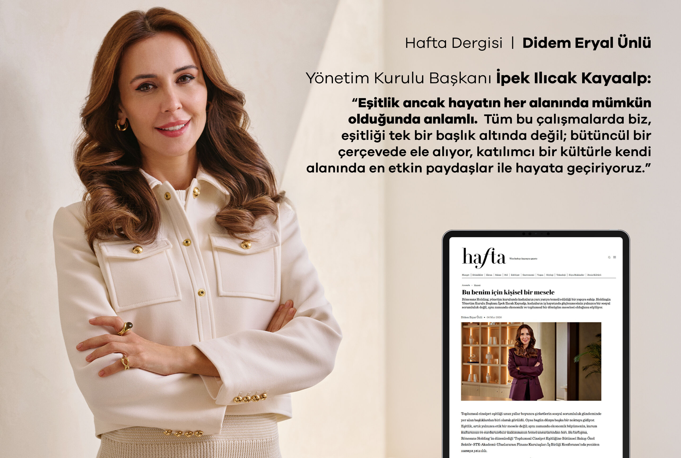 Rönesans Holding Yönetim Kurulu Başkanı İpek Ilıcak Kayaalp ile hem şirketin bu alandaki yaklaşımını hem de iş dünyasında kadınların güçlenmesi için atılması gereken adımları konuştuk. “Bugün 40 bin kişilik bir ekibiz ve farklı sektörlerde yılda yaklaşık 200 milyon insana temas ediyoruz. Bu nedenle aldığımız kararlar yalnızca şirket içinde kalmıyor, çok daha geniş bir etki alanı yaratıyor. Biz de bu etki alanının sorumluluğunu ciddiye alıyoruz” diyen Kayaalp’e göre mesele, yalnızca istihdam rakamlarını artırmak değil; daha derin bir kültürel dönüşüm yaratmak.